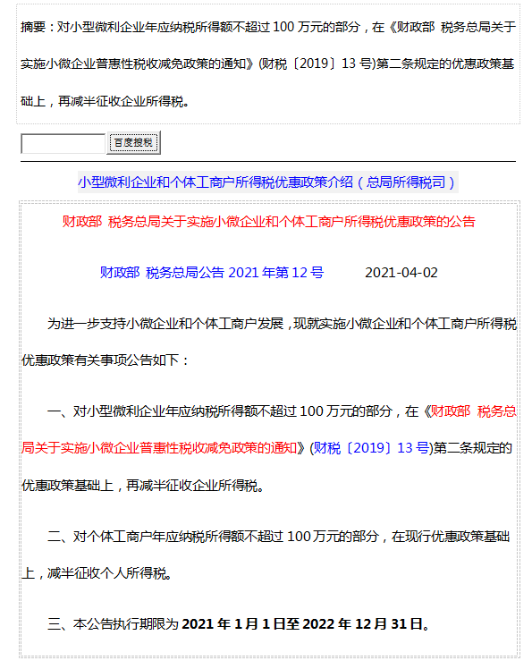 財政部 稅務總局公告2021年第12號 財政部 稅務總局關于實施小微企業(yè)和個體工商戶所得稅優(yōu)惠政策的公告