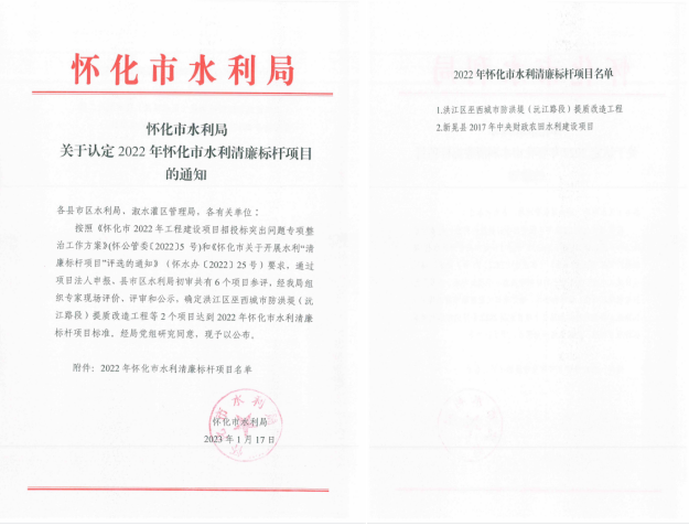 近日,從懷化市水利局傳來消息,懷化市水利水電工程有限公司(洪江區(qū)巫西城市防洪堤沅江路段提質(zhì)改造工程)喜獲“2022年度懷化市水利清廉標(biāo)桿項目”榮譽,清廉建設(shè)取得明顯成效和充分認(rèn)可。