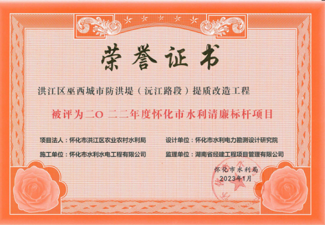 懷化市水利水電工程有限公司(洪江區(qū)巫西城市防洪堤沅江路段提質(zhì)改造工程)榮獲懷化市2022年度水利清廉標(biāo)桿項目